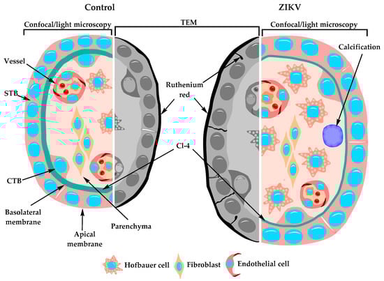 - Rosenberg, A.Z.; Yu, W.; Hill, D.A.; Reyes, C.A.; Schwartz, D.A. Placental Pathology of Zika Virus: Viral Infection of the Placenta Induces Villous Stromal Macrophage (Hofbauer Cell) Proliferation and Hyperplasia. Arch. Pathol. Lab. Med. 2017, 141, 43–48. [Google Scholar] [CrossRef] [PubMed]