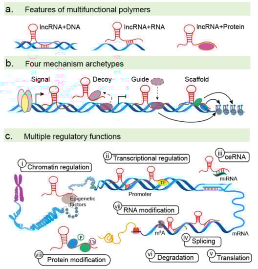 - Marchese, F.P.; Raimondi, I.; Huarte, M. The multidimensional mechanisms of long noncoding RNA function. Genome Biol. 2017, 18, 206. [Google Scholar] [CrossRef] [PubMed]
