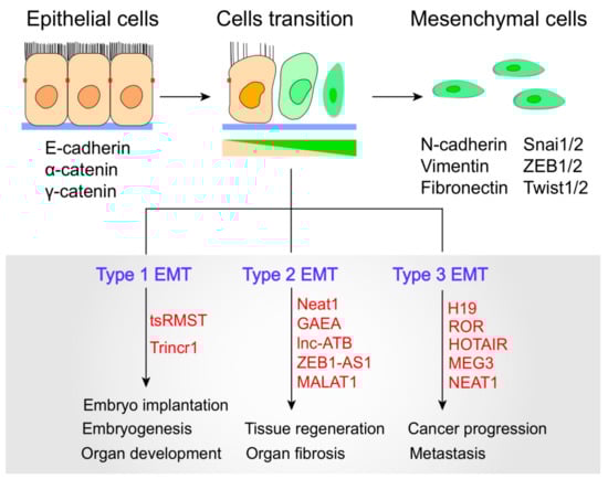 Recent studies have revealed that lncRNA dysregulation is associated with EMT in a wide spectrum of physiological and pathological processes. EMTs can be divided into three main biological subtypes. Type-1 EMTs are related to implantation, embryo formation, and organ development and are organized to generate diverse cell types with common mesenchymal phenotypes. Type-2 EMTs are related to wound healing, tissue regeneration, and organ fibrosis. Type-3 EMTs occur in neoplastic cells that have previously undergone genetic and epigenetic changes, especially in terms of genes that favor clonal outgrowth and localized tumor development [7] (Figure 2). Importantly, type-3 EMTs can affect oncogenes and tumor-suppressor genes, thus influencing invasive and therapy resistance property of cancer cells, and thereby generating the life-threatening manifestations of cancer progression [7,30]. To date, lncRNAs have emerged to act as important modulators in a multitude of cellular events ranging from embryogenesis to cell-fate determination. LncRNAs have been shown to modulate all types of EMTs by directly or indirectly interacting with EMT-related molecules. For example, in human embryonic stem cells, the trans-spliced noncoding RNA RMST (tsRMST) downregulates and suppresses Type-1 EMT and embryonic stem cell differentiation by reducing WNT5A expression [31]. Another example is Trincr1 (TRIM71 interacting long noncoding RNA 1), that can promote embryonic stem cells self-renewal and suppress ERK target genes through inhibiting TRIM71 [32]. Recent studies have indicated that lncRNAs can manipulate Type 2 EMT to regulate tissue regeneration and organ fibrosis, such as lncRNA Neat1, MALAT1 and lnc-ATB [33,34,35]. For example, Neat1 can be widely expressed in many tissues and play a key role in muscle cell formation, muscle regeneration and cancer cell proliferation. Neat1 inhibits P21 expression by recruiting Ezh2 to increase the level of H3k27me3 binding at the P21 promoter, thus resulting in the promotion of myoblast proliferation [35]. Moreover, MALAT1 and lnc-ATB can promote EMT during silica-induced pulmonary fibrosis by competitively binding miR-503 and miR-200c, respectively [33,34]. Dysregulated lncRNAs have been found to target diverse type 3 EMT-related genes and signaling pathways to increase epithelial plasticity. Specifically, the lncRNA ROR controls multiple signaling pathways involved in breast, bladder, and nasopharyngeal EMT [36,37,38].