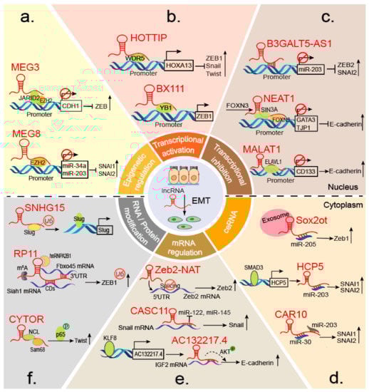 3.2. LncRNAs in EMTs at the Post-Transcriptional Level