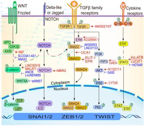 During EMT, lncRNAs induce the expression of various EMT TFs and alter critical molecules to regulate wound healing, development and tumor metastasis involving pathways, including the TGF-β, Wnt, and STAT3 pathways (Figure 4). The TGF-β pathway plays a central role in inducing EMT and can collaborate with several other signaling pathways (e.g., ERK, PI3K-AKT, and NF-κB) contributed to EMT programs. For example, lncRNA UCA1 and AC026904.1 are upregulated through the TGF-β/Smad and TGF-β/ERK pathways, respectively, to induce EMT in BC [58]. The Wnt signaling pathway is one of the most important pathways that is hyperactivated in cancers [110]. Furthermore, the Wnt pathway plays important roles in inducing different EMT-related phenotypes, culminating mainly in the nuclear translocation of β-catenin. LncRNA NEF and ANCR suppress Wnt/β-catenin signaling by manipulating the key protein β-catenin, which inhibits EMT [41,53]. STAT3 activation is crucial for its mediation of cytokine and growth factor-induced cellular and biological processes involved in cell development, proliferation, survival, and inflammation [111,112]. Aberrations in the STAT3 pathway are intimately associated with the development of diverse cancer types [113,114]. For instance, lnc-ATB activates STAT3 signaling to promote HCC EMT by increasing IL-11 mRNA stability [27]. In addition to the aforementioned well-known pathways, other signaling pathways can participate in the induction of different EMT states in various cellular contexts. Recent studies have revealed that the lncRNA-associated NF-κB and Notch pathways regulate EMT states. Previous reports have also shown that certain drugs can inhibit cancer metastasis by blocking EMT in malignant cells and reduce drug susceptibility by deactivating EMT-related pathways, including the AKT and STAT3 signaling pathways [115,116,117]. Therefore, developing inhibitors that target lncRNAs could effectively control EMT-related processes. Interrupting interactions between lncRNAs that have specific expression characteristics in different EMT states and various signaling pathways represent a novel means of controlling the EMT process.