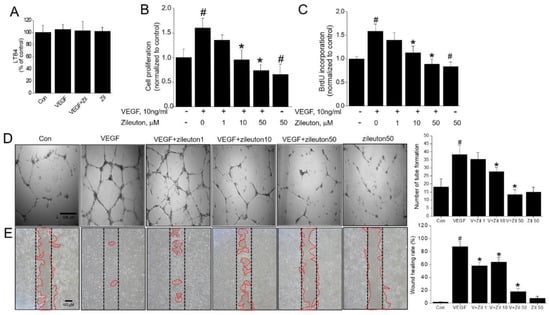 HUVECs seeded at a density of 1 × 105 cells/well in 12 well plates were incubated with various concentration of zileuton (1–50 µM) for 1 h and then exposed to VEGF (10 ng/mL) for 24 h. At the end of the treatment, MTT assay was carried out as previously reported [31]. Briefly, cells were cultured with MTT at a final concentration of 0.5 mg/mL for 4 h. Produced purple formazan crystals were dissolved using DMSO and the optical density (OD) was measured at 570 nm using a Perkin Elmer VictorX4 (Waltham, MA, USA) microplate reader.