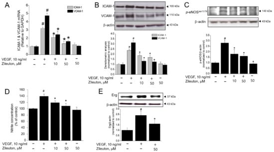 Effects of zileuton on VEGF-induced angiogenic factors in HUVECs. Cells were pretreated with zileuton (10 and 50 µM) for 1 h prior to VEGF treatment (10 ng/mL). After 8 h (qPCR) or 24 h (Western blot, Nitrite levels) stimulation with VEGF, (A) qPCR was performed for ICAM-1 and VCAM-1. (B–C, E) Western blot analysis was performed using antibodies against ICAM-1, VCAM-1, eNOSser1179, and Erg. (D) Nitrite levels were measured by Griess reagent kit. Protein expressions were quantified by densitometry and normalized by their control. Immunoblots shown are representative of three independent experiments. # p < 0.05 versus non-treated cells and * p < 0.05 versus VEGF-treated cells.