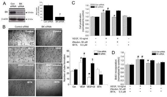 For BK channel siRNA transfection, HUVECs were transfected with either BK channel targeted siRNA (30 nM; Santa Cruz Biotechnology) or control siRNA using LipofectamineTM RNAiMAX (Invitrogen, Carlsbad, CA, USA) in Opti-MEM medium according to the manufacturer’s instructions. Cells were incubated for 12 h, media were replaced with normal culture medium. After 24 h incubation, cells were exposed to VEGF (10 ng/mL) for 6 h (for the tube formation assay) or 24 h (for the migration or BrdU assay) in the absence or presence of zileuton (50 µM). Efficiency of BK channel knockdown was measured by Western blot analysis against BK channel antibody.