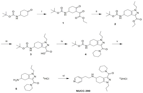 The outline of the chemical synthesis of NUCC-390 is shown in Figure 1. This procedure delivers the drug in high yields. It begins with 4-(Boc-amino)cyclohexanone to build the corresponding substituted oxo-(2-oxo-cyclohexyl)-acetic acid ethyl ester compound (1) through a Claisen condensation with diethyl oxalate. In the second step, the pyrazole ring was generated by condensation of the 1,3-diketone group of 1 with propylhydrazine to obtain (2). Following this step, the hydrolysis of the ethyl ester group of (2) in basic conditions led to the corresponding carboxylic acid compound (3), which was then coupled with piperidine to obtain the piperidine amide (4). Finally, cleavage of the tert-butyloxycarbonyl (Boc) group was performed to obtain (5), which was conjugated with 4-vinylpyridine through Michael addition to give NUCC-390.