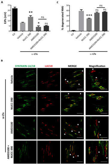 As CXCL12α stimulates the recovery of motor axon terminal function after degeneration induced by α-LTx [8], we tested whether NUCC-390 exerts a similar pro-regenerative activity in the same model. α-LTx is a pore-forming toxin that induces a fast, synchronous and complete degeneration of motor axon terminals, causing neuromuscular paralysis. Yet, in a few days in mice, degeneration is followed by a spontaneous recovery, which can be accurately and quantitatively monitored by recording the evoked junction potentials (EJPs) [50,51]. The analysis was performed 72 h after toxin injection, a time point where the functional activity of injured nerve terminals is about 50% rescued, thus allowing a better estimation of the efficacy of pro-regenerative treatments. Quantitative measurement of EJPs reported in Figure 3A shows that NUCC-390 strongly stimulates the recovery of neurotransmission after complete motor axon terminal degeneration, similar to what was previously reported for the recombinant chemokine [8]. Importantly, this pro-regenerative action was completely abrogated when mice were pretreated with AMD3100, a specific CXCR4 inhibitor. Noticeably AMD3100, by itself, lowers the physiologic regeneration process by preventing the activity of endogenous CXCL12α [8]. Imaging of the same muscles with specific antibodies against pre- and post-synaptic markers (Figure 3B), and the relative semiquantitative analysis (Figure 3C) confirm the electrophysiological results, showing a higher percentage of re-innervated NMJ in NUCC-390 treated muscles with respect to untreated samples. These data indicate that NUCC-390 action at the damaged NMJ closely resembles that of CXCL12α: by promoting recovery of function and structure of degenerated NMJ in mice, it represents a strong candidate to support peripheral regeneration also in humans.