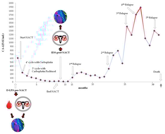 Graphical representation of CA-125 levels across the disease/treatment course of the patient diagnosed with HGSOC. The two time points, at D-LPS (pre-NACT) and at IDS (post-NACT), in which blood and ovarian tumor tissue samples were collected, are highlighted. CA-125: cancer antigen 125; D-LPS: diagnostic laparoscopy; NACT: neo-adjuvant chemotherapy; IDS: interval debulking surgery; HGSOC: high-grade serous ovarian cancer.