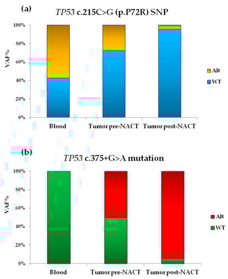 Graphic representation of VAF observed for SNVs in TP53 identified by NGS in blood (reference) and tumor tissue samples, collected at pre-therapy (pre-NACT) at the D-LPS and post-therapy (post-NACT) at the IDS, from a patient with HGSOC. (a) Bar-graph shows VAF decrease in pre- (27.71%) and post-NACT (4.21%) tumor samples, indicating prevalence of the WT “C” allele (blue bar) compared to the Alt “G” allele (yellow bar) at IDS for the TP53 c.215C>G (p.P72R) SNP, present in heterozygosis (57.31%) in the blood reference sample; (b) Bar-graph shows VAF increase in pre- (50.13%) and post-NACT (94.33%) tumor samples highlighting prevalence of the Alt “A” allele (red bar) compared to the WT “G” allele (green bar) in the HGSOC tissue sample collected at IDS of TP53 c.375+1G>A mutation, absent in the blood reference sample (only WT “G” allele, green bar). VAF: variant allele frequency; NACT: neo-adjuvant chemotherapy; HGSOC: high-grade serous ovarian cancer; D-LPS: diagnostic laparoscopy; IDS: interval debulking surgery; Alt: alternative; WT: wild-type.