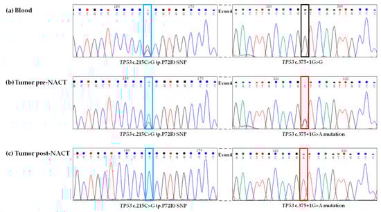 Further, peaks visualized in the chromatograms from Sanger sequencing were concordant with VAFs obtained with NGS approach. However, the standard sequencing approach could not discriminate allelic imbalance from a homozygous nucleotide change. In the reference (germline) blood sample, the presence of TP53 c.215C>G polymorphism in heterozygosis and absence of the mutation TP53 c.375+1G>A was evidenced (Figure 3a). In the pre-NACT chemo-naïve sample, the intronic alteration flanking exon 4 in heterozygous state was confirmed, as well the presence of polymorphism TP53 c.215C>G with a diminished peak related to the “G” variant allele (Figure 3b). In post-NACT tumor sample, both SNVs identified showed homozygosis of Alt/mutant “A” allele (or suspected loss of the of the WT “G”) and of the WT “C” allele (or suspected loss of the Alt/mutant “G” allele), for the TP53 c.375+1G>A and TP53 c.215C>G variants, respectively (Figure 3c).