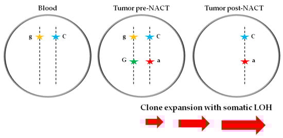 Representative model of double TP53 SNVs in trans configuration identified in the pre-NACT/chemo-naïve HGSOC sample at D-LPS, with clone expansion and somatic LOH in the post-NACT tumor sample collected at IDS. In normal cells (Blood) at the germline level, only the TP53 SNP c.215C>G was detected; in the chemo-naïve/untreated (Tumor pre-NACT) sample, the splice mutation TP53 c.375+1G>A was present with the minor Alt allele in trans to the WT allele of polymorphism TP53 c.215C>G; in the post-therapy/treated (Tumor post-NACT) sample, the complete clone expansion with somatic LOH was observed with loss of the minor Alt allele for TP53 c.215C>G SNP and loss of the WT allele for TP53 c.375+1G>A mutation. Alt allele of the mutation TP53 c.375+1G>A is represented in red, the reference WT in green; Alt allele of the polymorphism TP53 c.215C>G is colored in orange, the reference WT allele in blue; the minor Alt alleles are in lower-case letters, the WT alleles are in upper-case letters. VAF: variant allele frequency; NACT: neo-adjuvant chemotherapy; HGSOC: high-grade serous ovarian cancer; D-LPS: diagnostic laparoscopy; IDS: interval debulking surgery; Alt: alternative; WT: wild-type; LOH: loss of heterozygosity.