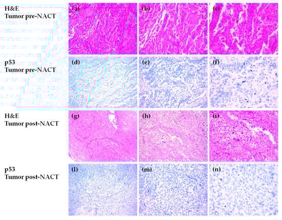 Hematoxilin and eosin (H&E, 5×, 10× and 20× magnification) of HGSOC sections collected at D-LPS (pre-NACT) and at IDS (post-NACT) and immunohistochemical staining for p53 (10×, 20× and 40× magnification). (a–c) H&E of bouin-fixed, paraffin-embedded tumor tissue collected at D-LPS showing the serous ovarian carcinoma architecture of HGSOC case with somatic mutation in TP53 (a: 5×; b: 10×; c: 20×); (d–f) Absent (-) nuclear p53 expression on tumor tissue collected at D-LPS of HGSOC case with somatic mutation in TP53 (d: 10×; e: 20×; f: 40×); (g–i) H&E of formalin-fixed, paraffin-embedded tumor tissue collected at IDS showing the serous ovarian carcinoma architecture of HGSOC case with somatic mutation in TP53 (g: 5×; h: 10×; i: 20×); (l–n) Absent (-) nuclear p53 expression on tumor tissue collected at IDS of HGSOC case with somatic mutation in TP53 (l: 10×; m: 20×; n: 40×). No cytoplasmic staining was observed. NACT: neo-adjuvant chemotherapy; HGSOC: high-grade serous ovarian cancer; D-LPS: diagnostic laparoscopy; IDS: interval debulking surgery.