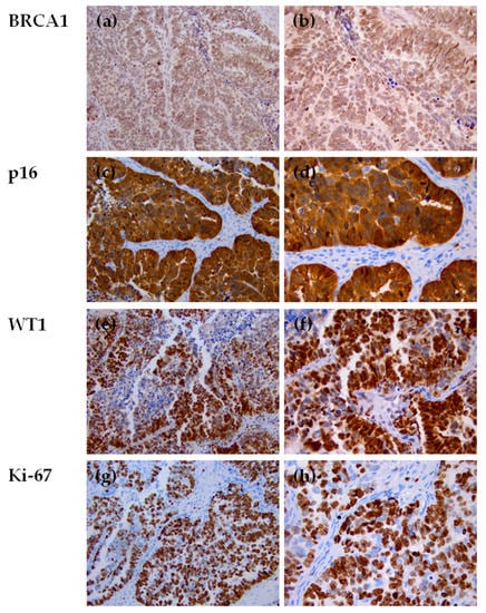 Immunohistochemical staining for BRCA1, p16, WT1, and Ki-67 of HGSOC sections collected at D-LPS from a patient diagnosed of HGSOC, before NACT (20× and 40× magnification). (a,b) Positive nuclear staining for BRCA1 observed in ~95% of tumor cells (a: 20×, b: 40×); (c,d) Diffuse nuclear and cytoplasmic staining of p16 exhibited by ~95% of tumor cells (c: 20×, d: 40×); (e,f) Nuclear and cytoplasmic staining for WT1 observed in ~70% of tumor cells (e: 20×, f: 40×);(g,h) Diffuse nuclear staining of Ki-67 observed in ~95% of tumor cells (g: 20×, h: 40×). NACT: neo-adjuvant chemotherapy; HGSOC: high-grade serous ovarian cancer; D-LPS: diagnostic laparoscopy; BRCA1: BRCA1 DNA repair associated; WT1: Wilms tumor 1.