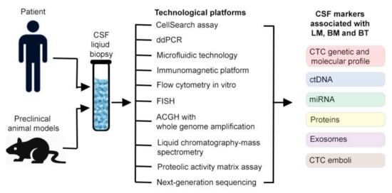 The limitations of cytology and deadly nature of LM, BM and BT encouraged researchers and clinicians to develop more sensitive and accurate markers using modern technologies. During the past decade, substantial efforts have been made to assess CSF samples using new concept of liquid biopsy (Figure 1) [,,,,,,,,,,,,,,].