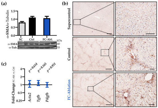 Despite interindividual differences within the control- and fibrocyte-ablated group, the overall hepatic expression of α-SMA was comparable both on protein- (Figure 3a,b) and transcriptional level (fold-change 1.08; 95% CI: 0.80–1.44; p = 0.614; Figure 3c). Immunohistochemical staining (Figure 3b), furthermore, revealed a similar staining intensity and distribution pattern of α-SMA. Additionally, we investigated the gene expression of the most potent myofibroblast activators TGF-β and PDGF. Both were expressed about equally in the control and the fibrocyte-ablated group (fold-change 1.16 and 0.99; p = 0.165 and 0.951; Figure 3c, full data in Figure S5a–c).