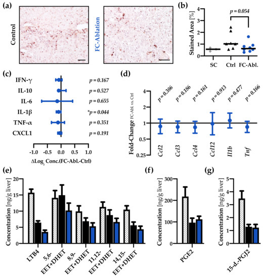 Next, we evaluated the hepatic infiltration and proliferation of inflammatory cells. While histological grading, performed on routine hematoxylin/eosin-staining, did not retrieve significant differences in result of fibrocyte-ablation (Table S6), immunohistochemical staining and subsequent morphometric analysis of the pan-leucocyte marker CD45 hinted at a decreased number of CD45-positive cells in the liver (p = 0.054; Figure 4a,b).