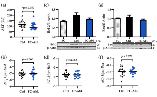 Cell death is a key event in the pathogenesis of liver fibrosis. Significantly reduced serum levels of alanine amino transferase (ALT) demonstrated a mitigation of liver-specific cellular damage in the fibrocyte-ablated group (−20.9%; 95% CI: 0.4–36.9%; p = 0.049; Figure 5a). High-throughput gene expression analysis indicated a decrease of the extracellular death ligand FAS (Figure S3), providing a possible explanation in the differential regulation of apoptosis. Subsequently performed quantitative real-time PCR, however, did not support a regulation of Fasl (fold-change 1.04; 95% CI: 0.83–1.34; p = 0.666; Figure 5b). Even more, further analyses displayed a subtle downregulation of the antiapoptotic factor Bcl-2 as a consequence of the depletion of fibrocytes (Figure 5c). Neither the transcriptional analysis of Bcl2 (fold-change 0.97; 95% CI: 0.83–1.13; p = 0.661; Figure 5d), nor western blotting (Figure 5e) and quantitative real-time PCR of the Bcl-2 associated factor Bax (fold-change 0.99; 95% CI: 0.86–1.15; p = 0.921; Figure 5f) corroborated a general regulation regarding the Bcl-2 family.