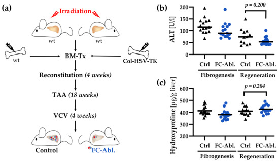 5 × 106 bone marrow (BM) cells were transplanted from male Col-HSV-TK (FC-Ablation) or C57BL/6J wild-type mice (Control) into 12 weeks old lethally irradiated (11 Gy, 60Co) female C57BL/6J mice via tail vein injection (n = 16 for each group). For FC depletion during fibrogenesis after 4 weeks of reconstitution 300 mg/l TAA (Sigma-Aldrich, Munich, Germany) and 8.3 mg/l VCV (Roche, Basel, Switzerland) were administered orally via drinking water for 18 weeks. Mice were sacrificed at the age of 34 weeks. A summary of the animal experiment is depicted schematically in Figure 1a.