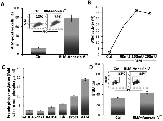 ATM is known to function in cell survival [27,28] and to phosphorylate a high number of proteins during double-strand DNA breaks repair. Bleomycin (BLM) induces, ATM in Annexin-V(−) MLEs, (Figure 2A, with graphical presentation, left panel and insert), ATM activation (Figure 2B) and an array of phosphorylated proteins (fold ratio to saline-treated MLEs) of ATM cascade; Erk, ATM, BRCA1, RAD50, GADD45 and chk1 in BLM-Annexin-V(−) MLE cells (Figure 2C). Concomitantly we show here increased proliferation in BrdU uptake from a percentage of 33% in saline-treated MLEs (Ctrl) to 44% (Figure 2D with graphical presentation), in bleomycin-treated MLEs.