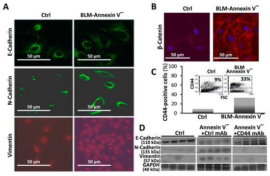 CD44 is a known marker of mesenchymal cell phenotype. First we detected, in flow cytometry, increased CD44 expression (Figure 3C, BLM-Annexin-V(−) vs. Ctrl), specifically in BLM-Annexin-V(−) MLEs, compared to control saline-treated MLEs (Figure 3C). EMT was further confirmed in Wb showing decreased E-cadherin with increased N-cadherin and vimentin in BLM-Annexin-V(−) MLE cells compared to controls (Figure 3D, BLM-Annexin-V(−) vs. Ctrl). Moreover, when BLM-Annexin-V(−) MLEs were treated with KM81 mAb (0.1 mg/mL, 5 min, 4 °C), a CD44 antagonist, E-cadherin levels induced by bleomycin, returned significantly to normal (Ctrl, 4D2 mAb) and those of N-cadherin and vimentin, were downregulated, (Figure 3D, BLM-Annexin-V(−) +Ctrl mAb vs. BLM-Annexin-V(−) + CD44 mAb).