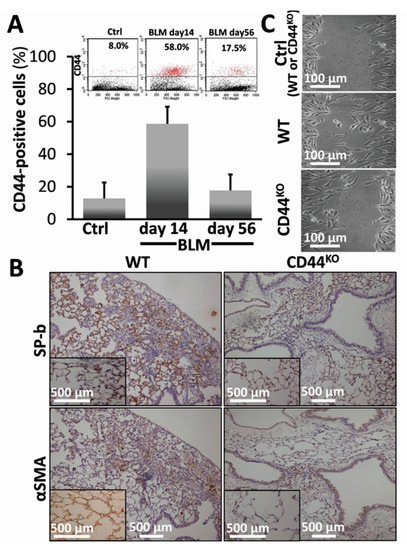 We previously detected bleomycin-induced reactive oxygen species (ROS) resulting in oxidative stress, mitochondrial leakage, DNA damage response (DDR), and apoptosis, in normal alveolar epithelial cells (AECs) [1]. Interestingly, the main inducers of apoptosis can also promote EMT, suggesting that EMT could potentially serve as a pathway for escape from cell death [2]. EMT occurs during embryonic development and organogenesis and represents an obstacle to tissue regeneration following injury. Thus, EMT may also cause diseases such as fibrosis, cancer, rheumatoid arthritis, tissue degradation, and others [3,4]. Many EMT inducers act directly or indirectly by repressing E-cadherin, increasing vimentin and α–smooth muscle actin (αSMA) [3], a set of incidences that promote accumulation of myofibroblasts in injured tissues, which characterizes fibrotic diseases [5], including idiopathic pulmonary fibrosis (IPF). CD44 is described as one of the primary factors contributing to EMT, especially in cancer [4], where it is regarded as one of the stem markers, but also in inflammation [6], atrial fibrosis [7], and renal fibrosis [8]. Involvement of CD44 in EMT during pulmonary fibrosis as opposed to tissue regeneration (both in clinic and in experimental animals) is more scant [9]. Moreover, IPF in aging, which as opposed to juvenile subjects, lack the possibility of tissue regeneration and do not resolve fibrosis [10], correlates with increments in oxidative stress [11].