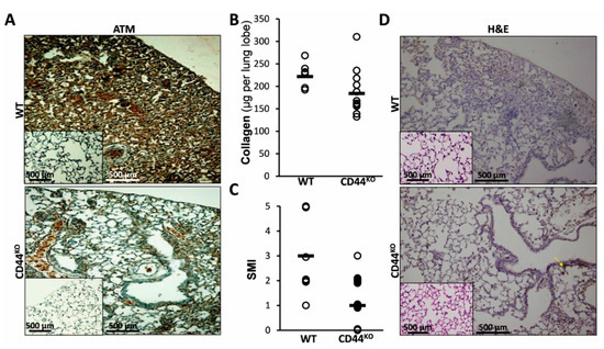 Normal lung regeneration following bleomycin-injury in chimeric-CD44KO mice, compared to congenic-controls. (A) ATM staining in lung tissue sections from C57BL/6 WT vs. chimeric-CD44KO mice at day 14 of bleomycin and control-saline (inserts). Representative of 4–5 sections in 3 separate experiments with similar results, n = 7–10. (B) Graphical presentation of Sircoll-collagen assay and (C), of a semi-morphological index (SMI) of H&E staining (see D), at day 14 post-BLM in WT and CD44KO. Bars (▬) represent median score. Three lung sections were scored from each animal, using a grading scheme as follows: grade 0 – normal tissue; grades 1–5 were used for animals with regenerated tissue (grade 0 to 1) or pulmonary inflammation and fibrosis, with higher grades (2 to 5) indicating more severe lesions [24]. Representative results from three independent experiments. For all comparisons, p < 0.05. (D) Hematoxylin-eosin (H&E) staining at day 14 post-BLM, in WT and CD44KO murine lung tissue sections. Representative of 4–5 sections in 3 separate experiments with similar results, n = 7–10.