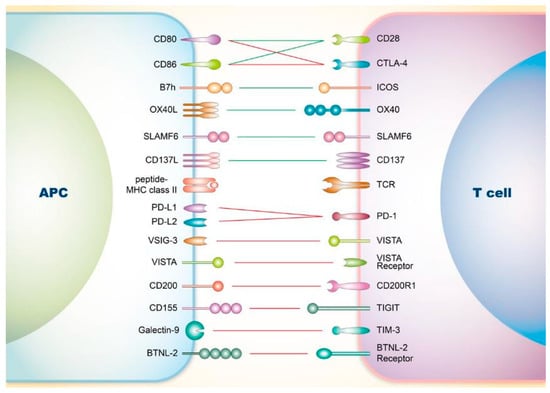 Since the discovery of CD28, the receptor for CD80 (B7.1) and CD86 (B7.2) proteins, as a prototype co-stimulatory receptor on T cells, the well-known two-signal model of T cell activation has been recognized, highlighting the fact that both TCRs and co-stimulatory signaling are essential for full T cell activation [,,]. Since then, various co-stimulatory pathways have been discovered (Figure 1), and some of them have been successfully utilized in treatments against autoimmune diseases as well as malignancies.