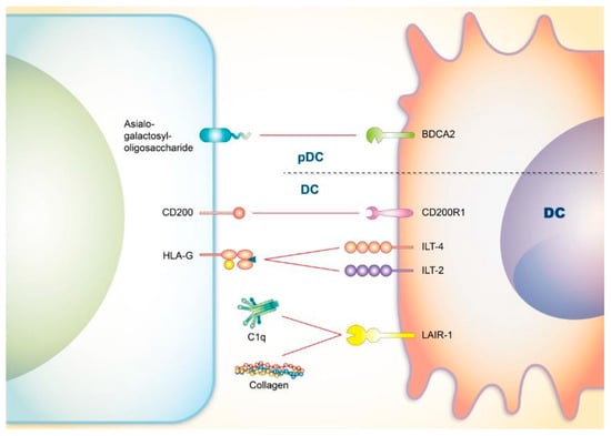 On the other hand, immunoglobulin-like transcript 4 (ILT4) expressed by DCs is a well-characterized co-inhibitory receptor and recognizes human leukocyte antigen-G (HLA-G) []. Human leukocyte antigen-G (HLA-G) is a class I non-classical HLA molecule that plays an important regulatory role in the immune system during viral infections and some autoimmune diseases []. Paola Del Carmen Guerra-De-Blas et al. reported that significantly lower levels of ILT4-positive circulating pDCs and cDCs were detected in SLE patients; this diminished expression of ILT4 may contribute to a higher immunogenic phenotype of DCs in SLE []. It has also been reported that monocytes from psoriatic arthritis patients reveal downregulated expression of ILT4, demonstrating that alterations of these inhibitory receptors may not be exclusive to SLE patients but, rather, a common characteristic that SLE shares with other autoimmune conditions []. ILT2, on the other hand, also recognizes a broad range of classic class I MHC molecules including HLA–G. ILT2 was found to be downregulated in both pDCs and cDCs from SLE patients []. Moreover, as the common ligand of these axes, HLA-G was found to be diminished in monocytes from SLE patients, and a compromised ability of these monocytes to inhibit the proliferation of autologous lymphocytes was also revealed [].