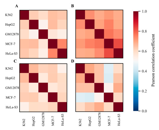 We then correlated these H3K4me1 histone modification profiles with the gene expression data obtained for the same cell lines (Figure 1). In this study, we considered RNA sequencing profiles because they are thought to represent the gold standard data in high throughput transcriptomic research [25]. In the ENCODE project repository, six profiles were available for cell line GM12878, 10 for cell line HepG2 and 22 for cell line K562. For the MCF-7 and HeLa-s3 cell lines, no RNA sequencing data were available. We observed a trend that H3K4me1 histone modification profiles positively correlated with the gene expression data (Figure 1). The highest correlations were observed for the long non-coding RNA genes (Figure 1D), the lowest was observed for microRNA genes (Figure 1C) and the intermediate pattern was observed for protein coding genes (Figure 1B). The highest correlations were detected between gene expression and histone modification profiles of the same cell lines (Figure 1). This confirmed that the H3K4me1 histone modification tags from the ENCODE database were related to their expected molecular functions.