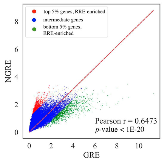 For the above linear model, we sampled 5% of genes having biggest distances from the NGRE-GRE trend line. The above and below 5% gene sets were considered, respectively, RRE-enriched and RRE-deficient (listed in Supplementary Table S5).