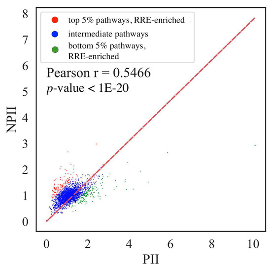 Comparison of PII scores (abscissa axis) and NPII scores (axis of ordinates) for human molecular pathways. Color indicates different pathway groups (red—RRE-enriched molecular pathways, blue—intermediate pathways, green—RRE-deficient molecular pathways). Each dot represents single pathway. Pearson correlation coefficient (r) and Pearson p-value (p) are shown separately.