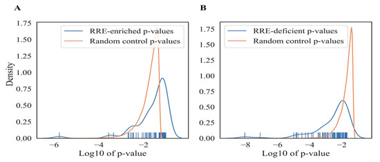 In order to evaluate the significance of the observed annotations obtained using RRE characteristics, we generated 500 random permutations of gene names and corresponding GRE or NGRE scores. For each permutation, 1204 top and 1204 bottom genes were randomly taken and used as described above for the real RRE-top and bottom genes. These randomly generated gene sets were then analyzed using DAVID software, and top-100 GO terms were selected by the lowest p-value for each random permutation. Finally, we compared the distributions of p-values for the real and random gene sets (Figure 5A,B for RRE-enriched and deficient genes, respectively). This type of analysis showed that the RRE-deficient molecular processes identified here were mostly statistically significant, because the peak value of real distribution (mode) was lower than the mode of random distribution (Figure 5B). However, most of all RRE-enriched GO terms overlapped with the random distribution (Figure 5A), although there were few GO terms with significantly lower p-values than for the random permutations. Since none of the 500 random permutations generated GO-terms with p-values lower than those observed for the real RRE-enriched or RRE-deficient genes, the overall q-values of confidence for both groups were smaller than 0.002, thus indicating a high confidence level of the biological processes identified.