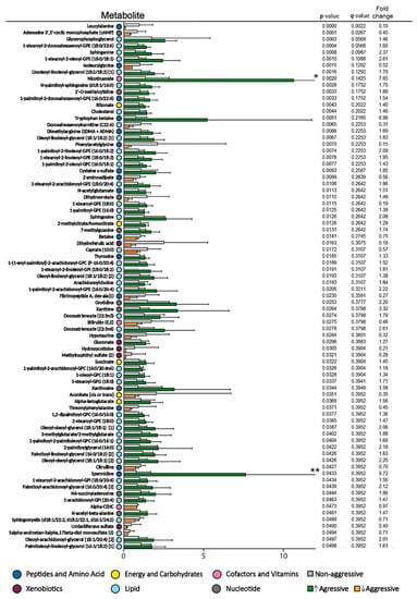 Significantly altered metabolites when comparing the pretreatment levels of non-responders with rapidly progressive disease versus non-responders with less aggressive disease to antileukemic treatment based on all-trans retinoic acid (ATRA) and valproic acid. The p-values, q-values and mean fold change values for each metabolite are listed to the right in the figure (ranked by p-value), and a fold change >1 indicates that the levels were increased in non-responder patients with very aggressive disease compared to non-responder patients with less aggressive disease. Levels of serum metabolites in non-responders with less aggressive disease are shown in grey, increased levels found in non-responders with aggressive disease are shown in green, while decreased levels in non-responders with aggressive disease are shown in yellow. Color codes for classification of metabolites are explained at the bottom of the figure. Error bars show Standard deviation (SD). * Nicotidamine SD 6.761, ** Spermidine SD 9.051.
