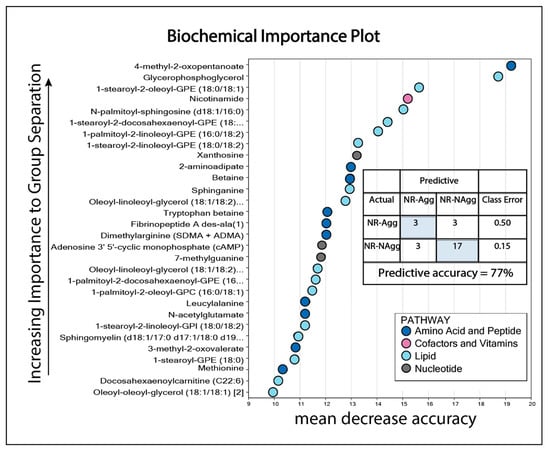 Six non-responders had rapidly progressive disease with increasing peripheral blood blast counts and survival ≤12 days (Table S1, patients 39–44). We compared the metabolomic profile of these six patients with the 20 other non-responders because, in clinical practice, it will be important to identify such patients and start early with alternative therapy. This early cutoff was chosen because a clinically relevant response is usually seen after 2–3 weeks of treatment with ATRA/valproic acid [19,27]. Eighty of the 886 metabolites differed significantly between these two groups (Figure 1, Table S2). Most of the metabolites had a relatively high q-value, but when considering the relatively high number of significantly altered metabolites (80 out of 886 metabolites) and the overall metabolomic profiles/pathways (instead of individual metabolites), the most striking difference between these two groups was the high number of lipid metabolites (45 out of 80 metabolites) of which patients with rapidly progressive disease showed increased levels for 42 out of these 45 lipid metabolites (a more detailed classification of metabolites is presented in Table S2). Thus, the six non-responders with rapidly progressive disease seem to differ from the 20 other non-responders especially with regard to lipid and fatty acid metabolites. Finally, a random forest analysis showed a predictive accuracy of 77% (Figure 2), suggesting that it might be possible to use metabolite profiles to segregate these groups; however, the group size of aggressive non-responders is very small, and the results therefore need to be confirmed in a larger study. The 30 top-ranked metabolites from the random forest analysis included 26 metabolites with a p-value < 0.05 (six amino acid metabolites, 16 lipid metabolites, and four other metabolites; see Figure 1 and Figure 2).