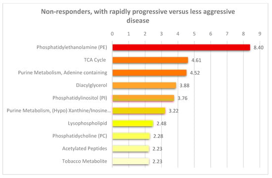 Pathway enrichment analysis based on altered metabolites between non-responder patients with rapidly progressive disease (i.e., aggressive disease) versus non-responders with less aggressive disease. This analysis was based on significantly altered metabolites p < 0.05 (see Figure 1). Only pathways with an enrichment value greater than two and at least two metabolites within each pathway are shown in the figure.
