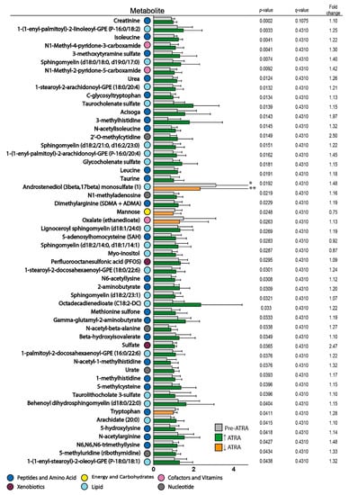 We compared the serum metabolite profiles before and after two days of ATRA monotherapy for ten patients from the first clinical study (Table S1, the first five responders and five non-responders) [27]. A total of 54 metabolites were then significantly altered after ATRA monotherapy (paired t-test, p < 0.05, Figure 4), though all metabolites had high q-values (q > 0.1, Figure 4). However, of the 54 altered metabolites, a large majority of 50 metabolites were increased after ATRA treatment.