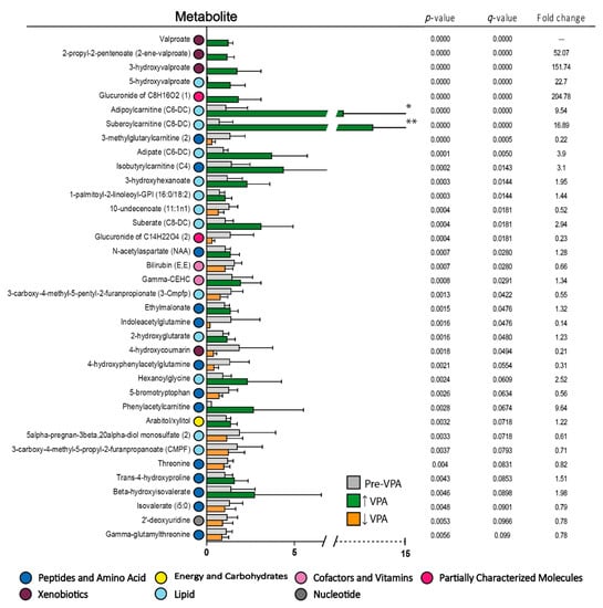 Identification and classification of serum metabolites that differed significantly when comparing samples taken prior to treatment and after seven days of valproic acid (VPA) therapy. Thirty-six metabolites differed significantly between untreated and VPA-treated samples (p < 0.05, Welch′s two sample t-test), with q-value < 0.1 (the upper 23 metabolites with q < 0.05). The p-values, q-values, and mean fold change for each metabolite are listed to the right in the figure (ranked by p and q-value), and a fold change >1 indicates that the levels were increased after valproic acid therapy. Metabolite levels found in pretreatment samples are shown in grey, while increased levels during treatment are shown in green (22/36 increased) and decreased levels during treatment are shown in orange (14/36 decreased). Color codes for classification of metabolites are explained at the bottom of the figure. Error bars show Standard deviation (SD). *Adipoylcranitine (C6-DC) SD 6.928 **Suberoylcarnitine (C8-DC) SD 8.50.