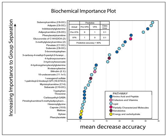A pathway enrichment analysis for differential metabolites after valproic acid treatment revealed enrichment of pathways relating especially to lipid metabolism as well as amino acid metabolism (Figure 7). As discussed above, several lipid and fatty acid metabolites were altered after valproic acid therapy, including increased levels of several fatty acid-carnitines (Figure 5, Figure S5). This is consistent with impaired β-oxidation, and the increased levels of five out of nine significantly altered dicarboxyl fatty acids suggests that ω-oxidation is used as an alternative mechanism in the liver to compensate for impaired β oxidation [57]. Furthermore, a total of 33 amino acid metabolites were significantly altered by valproic acid, in particular metabolites reflecting tryptophan (six metabolites) and valine/leucine/isoleucine metabolism (eight metabolites). Seven amino acid metabolites were also included among the top-ranked metabolites in the random forest analysis (Figure 6). In our analysis, the 109 metabolites with significant p-values < 0.05 (but high q-value) had a similar overall profile as that found for metabolites with p < 0.05 and q < 0.05 (Figure 5), mainly consisting of metabolites belonging to amino acid (see Figure S7) and lipid pathways (see Figure S8), whereas metabolites reflecting the carbohydrate and energy metabolism were scarce.