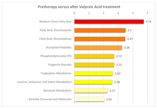 Pathway enrichment analysis based on metabolites altered after seven days of valproic acid treatment compared to pretherapy levels. This analysis was based on significant altered metabolites p < 0.05 (see Figure S5), and only pathways with an enrichment value greater than two and at least two metabolites within each pathway are shown. The most significant pathway is shown in red and less significant pathways in light yellow.