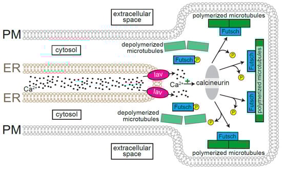 As mentioned at the end of the previous section, the relationship between the structures of neurons and the underlying ER is inherently bidirectional. While neuronal architecture imposes specific constraints on ER morphology, ER Ca2+ release and the channels involved therein influence the structure of neurons. Analyses of invertebrate synapses have revealed several aspects of the interplay between Ca2+ and neuronal structure and function. Since the sites of neurotransmitter release are located within clearly identifiable presynaptic boutons at Drosophila neuromuscular junctions (NMJ) [26,27,28], determinants of bouton morphology and number at these synapses have been matters of intense study. The stereotypical arborization of axon termini at Drosophila NMJs is strongly influenced by the stability of presynaptic microtubules, which depends on the microtubule binding protein 1b (MAP1b) homolog, Futsch (Figure 1) [29,30,31]. Futsch–microtubule association promotes microtubule stability, whereas diminished interaction with Futsch results in microtubule depolymerization and stereotypical alterations in NMJ morphology—larger but fewer boutons [23,29,30,31]. As is the case for many microtubule binding proteins, Futsch–microtubule association is inversely correlated with Futsch phosphorylation [32]. Ca2+ release via the ER-resident transient receptor potential vanilloid (TRPV) channel, Inactive (Iav) [33,34], leads to activation of the Ca2+-dependent phosphatase, calcineurin (Figure 1) [23]. Once activated, calcineurin mediates Futsch dephosphorylation, increased microtubule stability, and normal bouton morphology [23]. Decreased abundance of Iav and Drosophila homologs of the ER channels, inositol triphosphate receptors (IP3Rs), and ryanodine receptors (RyRs), results in diminished calcineurin activity, loss of presynaptic microtubules, and attendant alterations in bouton number and morphology [23]. The observation that activities of Iav, IP3R, and RyR are required for regulation of presynaptic morphology points to functional interactions between these channels in the regulation of ER Ca2+ release and synapse development.