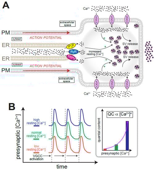 Axons contain the domains responsible for the release of neurotransmitter-laden synaptic vesicles (SVs). The fundamentals of SV release, which are reasonably well-understood, can be succinctly summarized as a sequence of events starting with the arrival of action potentials to presynaptic termini, opening of voltage-gated Ca2+ channels (VGCCs), Ca2+ influx, and Ca2+/SNARE-dependent SV exocytosis (Figure 2A) [48,49]. According to this model, instructive signals that elevate presynaptic [Ca2+] to a range necessary for SV release are plasma membrane delimited, i.e., channels responsible for both action potential propagation and Ca2+ entry are located on the cell surface. Nevertheless, many studies have demonstrated the involvement of ER Ca2+ channels in sculpting the temporal dynamics and extent of SV release. The probability of SV release, defined as the likelihood that a primed SV will be released upon arrival of the action potential, is influenced by presynaptic resting [Ca2+] (Figure 2B) [23,49,50,51,52]. Given the 4th power relationship between [Ca2+] and quantal content (referred to as the nonlinear relationship between Ca2+ and vesicle release rates [53]), small changes in resting [Ca2+] exert considerable influence on neurotransmitter release (Figure 2B, inset) [23,49,50,51]. At the calyx of Held, for instance, even a 50 nM increase in resting [Ca2+] is sufficient to elicit an appreciable increase in SV release probability [51]. Many different processes, including Ca2+ entry and extrusion mechanisms, cooperate to determine presynaptic resting [Ca2+] [50]. Roles for ER Ca2+ and ER-resident channels in crafting resting [Ca2+] and SV release probability have been widely acknowledged (Figure 2A) [23,54,55,56,57,58,59,60,61,62]. At the hippocampal Schaffer-collateral pathway, deletion of presenilin in presynaptic CA3 neurons perturbs short-term plasticity via hyperactivation of RyRs [54,59]. Elevations in RyR-mediated ER Ca2+ release promote both spontaneous SV release and the probability of evoked events [55,63,64]. Furthermore, either the induction of passive leak of ER Ca2+ following inhibition of the Ca2+ ATPase, SERCA, or activation of IP3R mediated ER Ca2+ release are sufficient for presynaptic facilitation [54,65,66]. These data point to a role for ER Ca2+ release per se rather than an obligatory role for any specific channel type. Needless to say, the influence of ER Ca2+ release on overall network dynamics depends on the identity of the neurons experiencing the Ca2+ release events, as exemplified by the findings that increased RyR activity or inhibition of SERCA elevates the probability of GABA release in Purkinje neurons, which serves to dampen network activity in the cerebellum [56,57].