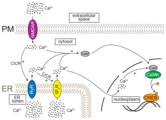 Ca2+-mediated activation of neuronal gene expression. Dendritic stimulation activates channels on the plasma membrane (PM), such as the N-methyl-D-aspartate receptor (NMDAR), which allow Ca2+ influx. RyR responds to Ca2+ entry and the signal is amplified through Ca2+-induced Ca2+ release (CICR). Subsequent activation of IP3R causes further Ca2+ release and activation of calmodulin (CaM). CaM may be activated either directly in the nucleus or in the cytosol, in which case it translocates to the nucleus, and activates Ca2+/calmodulin-dependent protein kinases (CaMKs). CaMKs phosphorylate cAMP response element binding (CREB) protein, which binds to DNA and drives changes in gene expression.