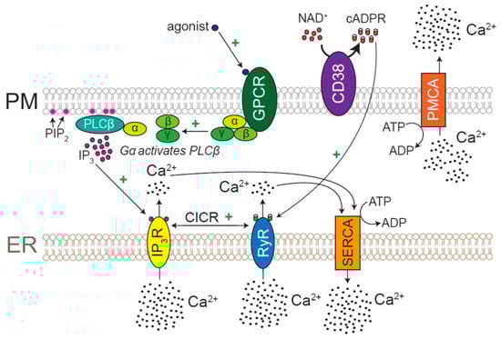 Mechanisms of ER channel activation. Activation of IP3R begins at the plasma membrane (PM), where agonist activation of G-protein coupled receptors (GPCRs) leads to dissociation of heterotrimeric Gq protein. Gq activates PLC, which cleaves phosphatidylinositol 4,5-bisphosphate (PIP2) into inositol trisphosphate (IP3) and diacylglycerol (DAG). IP3 serves as a second messenger and activates IP3R, causing ER Ca2+ release. Alternatively, RyR is activated by cyclic ADP ribose (cADPR), which is synthesized in the extracellular space from nicotinamide adenine dinucleotide (NAD+) by the ectoenzyme, CD38. Both IP3R and RyR are themselves activated by Ca2+ and can stimulate each via Ca2+-induced Ca2+ release (CICR). The resulting increase in cytosolic Ca2+ is removed by either plasma membrane Ca2+ ATPase (PMCA) or sarco/endoplasmic reticulum Ca2+-ATPase (SERCA), which pump Ca2+ into the extracellular space or ER, respectively.