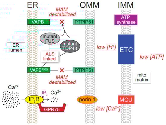 Various lines of evidence also point to ER Ca2+ dyshomeostasis stemming from perturbations in ER Ca2+ release and MAM assembly as being important pathological mechanisms in ALS, a lethal neurodegenerative disease characterized by motor neuron degeneration [275]. A familial form of ALS (ALS8) is caused by a mutations in the MAM resident protein, VAPB (for example, VAPBP56S), which participates in ER-mitochondrial tethering [275,276,277]. Although ALS8 is a rare form of ALS, decreased VAPB protein abundance has been observed in spinal cord motor neurons from patients with sporadic ALS [278]. In other forms of familial ALS, such as those caused by mutated variants of FUS and TDP-43, VAPB–PTPIP51 interactions are comprised with attendant decreases in mitochondrial [Ca2+] and ATP production (Figure 7) [279,280]. In accordance with the relationship between TDP-43 and ER Ca2+ homeostasis, a worm model of ALS exhibits ER Ca2+ dyshomeostasis that led to decline of neuronal function [281]. ALS-causing mutations in the gene encoding Sigma receptor-1, and C9orf72 hexanucleotide expansions (a leading cause of both sporadic and familial forms of ALS in populations with European ancestry) are also associated with ER Ca2+ dyshomeostasis due to combinations of elevated IP3R activity and diminished uptake into stores [282,283].