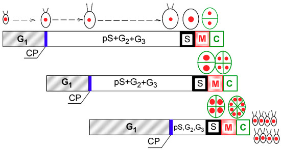 Schematic diagram of growth and the cell cycle in a single cell of Chlamydomonas reinhardtii. The schematic pictures reflect increasing cell size. The red full circles inside the cells illustrate the size and number of nuclei. Larger red circles indicate a doubling of DNA. Green ellipsoids and lines represent protoplast division. Diagram shows a model of cell cycle progression in C. reinhardtii dividing by multiple fission into 8 daughter cells. Three bars indicate three overlapping growth and reproductive sequences terminated by division into 2, 4, and 8 daughter cells, respectively. Precommitment period (G1): the period until threshold critical cell size for commitment to divide (CP) is reached and CP is attained. Postcommitment period consists of pS—the prereplication phase between the CP attainment and the beginning of DNA replication. The processes required for initiation of DNA replication are assumed to happen during this phase. S: DNA replication takes place. G2: the phase between the termination of DNA replication and the start of mitosis (M). Processes leading to the initiation of mitosis are assumed to take place during this phase. G3: the phase separating mitosis from cellular division, which is clearly visible in some algae dividing by multiple fission. The processes leading to cellular division are assumed to take place during this phase. C: the phase during which cell cleavage (protoplast fission) and daughter cell formation occurs. For C. reinhardtii, it is typical that all “gap” phases are combined into one prolonged phase. The distances between individual cell cycle phases correspond to the cell cycle progression in a real culture (Figure 2). Modified after Zachleder et al. [13], Bišová and Zachleder [14], and Zachleder et al. [15].