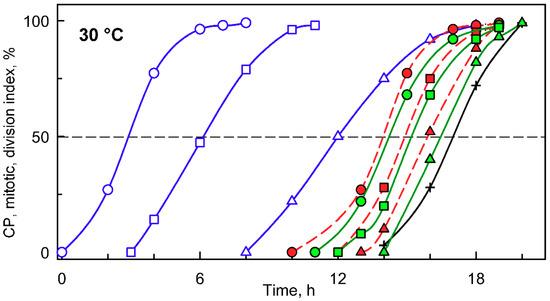 Graphical representation of the cell cycle progression in synchronized cultures of the Chlamydomonas reinhardtii grown at 30 °C at an incident light intensity of 500 μmol m−2 s−1. Time courses of individual commitment point/s, nuclear division/s, protoplast fission/s, and daughter cell release in synchronized cultures of C. reinhardtii. Blue curves (CP indices): cumulative percentage of cells, in a given population (100%), that attained the commitment point (CP) for the first (circles), second (squares), and third (triangles) reproductive sequence. Red curves (mitotic indices): cumulative percentage of cells, in a given population (100%), that divided their nuclei into 2 (circles), 4 (squares), and 8 (triangles). Green curves (division/protoplast fission indices): cumulative percentage of cells, in a given population (100%), that divided their protoplasts into 2 (circles), 4 (squares), and 8 (triangles). Black curve, crosses: cumulative percentage of cells that released daughter cells. Black dashed line at 50% depicts midpoint of each event in a population of cells.