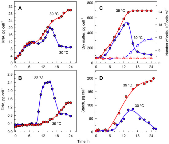The course of RNA synthesis (A), DNA replications (B), changes in the number of cells and concentration of dry matter (C), and total starch (D) in the synchronized culture of Chlamydomonas reinhardtii grown under continuous illumination of incident light intensity 500 μmol m−2 s−1 at 30 °C (blue lines and symbols) or 39 °C (red lines and symbols).