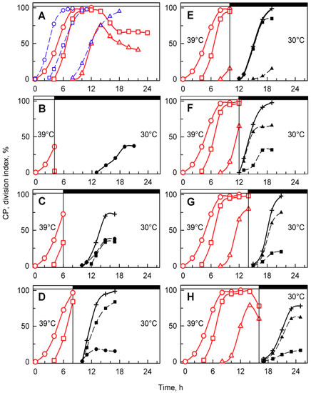 Synchronized cells cultivated at 39 °C grew similarly to their 30 °C controls (Figure 3 and Figure 4), but nuclear division and protoplast fission were inhibited, and daughter cells were not formed (Figure 3) even when put into darkness at 39 °C. This demonstrated that cell cycle arrest was dependent solely on temperature and not on a combination of light and temperature stress. Because of the absence of cell division in dark at 39 °C, to assess attaining of CP, cells growing at 39 °C were transferred to darkness at 30 °C (Figure 5A, red curves). At this temperature, the cells completed nuclear and cellular divisions and produced daughter cells, suggesting that during the relatively undisturbed growth at 39 °C, CPs were, indeed, attained, but the corresponding reproductive processes were blocked. The attainment of CPs at 39 °C was similar to that at 30 °C, with the first CP being delayed by about two hours at 39 °C, and the proportion of the population attaining the third CP for division into eight daughter cells was about 25% lower than controls (Figure 5A). After 16 or more hours of cultivation at 39 °C, the cells were no longer capable of complete recovery from the effect of high temperature, and the number of committed cells started to decrease (Figure 5A). The relationship between growth and CP attainment was maintained, as the proportion of dividing daughter cells produced in the dark increased with the prolongation of growth at 39 °C. Consequently, the number of daughter cells formed in the population that was transferred to darkness at 30 °C increased (Figure 5B–G) until the inhibitory effect of prolonged cultivation at 39 °C was manifested from the 16th hour (Figure 5H). Daughter cell release occurred at about the same time in cultures darkened at the 6th, 8th, 10th, and 12th hours (Figure 5C–F). It was slightly delayed in transfers after the 4th and 14th hours (Figure 5B,G) and delayed most in cultures transferred after the 16th hour. The delay in daughter cell release in cultures transferred at the 14th and 16th hour was most probably dictated by the fact that the entire reproductive sequence, including mitosis, protoplast fission, and daughter cell release, could have proceeded only after transfer to 30 °C.