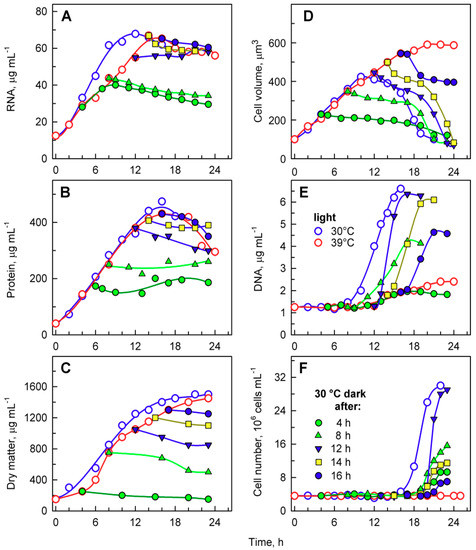 A more detailed analysis of the dark 30 °C recovery from growth at 39 °C confirmed that growth ceased once the cells were put into darkness. This is clear from changes in total RNA and protein as well as the amount of dry matter that remained constant after the dark transfer or was slightly reduced, probably due to using some reserves for dark metabolism (Figure 6A–C). Based on changes in mean cell volume, cells transferred to darkness at 30 °C, after 4 and 8 h at 39 °C, started to release daughter cells with a slight delay compared to control cells grown at 30 °C (Figure 6D); this was also confirmed by the increase in cell number (Figure 6F). Daughter cell release was delayed by 4–6 h in cultures transferred at 12 and 14 h (Figure 6D,F). Cells transferred after 16 h were not only slightly delayed in daughter cell release, as shown by changes in mean cell volume (Figure 6D), but the number of daughter cells released (2.6-fold increase) was lower than the number expected from direct counting of cell divisions (3.8-fold increase; compare Figure 5H and Figure 6F). This was caused by some of the divided daughter cells not hatching and staying connected in clumps.