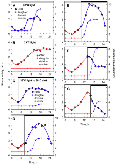 Transfer from light at 39 °C to darkness at 30 °C did not affect the timing of the CP-related peak, but in most cases, it resulted in a shift of timing and extent of CDK activity of the second peaks related to DNA replication, and possibly nuclear and cellular division. For transfer after cultivation for 4 h in light at 39 °C, the second peak occurred at a comparable time point as at 39 °C and preceded the onset of DNA replication. This was comparable to the peak in 39 °C grown cells with similar levels of DNA replication (Figure 7C). For cultures transferred to darkness at 30 °C after 8 h at 39 °C, the second peak of CDK activity occurred 3 h earlier (Figure 7D) and again preceded the onset of DNA replication, followed by nuclear and cellular divisions. The peak was more pronounced either because more DNA was replicated or because of the simultaneous occurrence of nuclear and cellular divisions. After transfer at 12 h, the increase in CDK activity started similarly to the 39 °C control, but reached the peak five hours later, and the CDK activity was double that of the peak at 39 °C (Figure 7E). The increase corresponded with the onset of DNA replication as well as nuclear and cellular divisions that occurred between 12 and 18 h. Once cell division was complete, CDK activity decreased. Transfer after 16 h at 39 °C occurred after the DNA replication-related peak was attained at 39 °C, and following the transfer, CDK activity increased again and attained another peak 2–3 h later. This peak corresponded to the completion of further DNA replication as well as nuclear and cellular divisions.