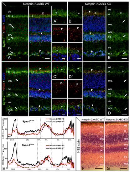 Both antibodies detected Syne-2 in the Syne-2/Nesprin-2 KO and WT control retinae with Syne-2 immunoreactivity being present throughout the different retinal layers: the photoreceptor inner segments (IS), the outer nuclear membrane of retinal cells in the outer nuclear layer (ONL), the membrane of the inner nuclear (INL), and the ganglion cell layer (GCL). Comparing the staining between the two genotypes, Syne-2 immunofluorescence was noticeably weaker in the IS and the ONL of the Syne-2/Nesprin-2 KO retinae (Figure 1B,D,E) compared to the WT controls (Figure 1A,C,E). Double labeling of Syne-2 and Pcnt showed i) a co-distribution of Syne-2/Pcnt at the ciliary region of the photoreceptors in both genotypes and ii) a Pcnt staining at the centrosomes in the INL and GCL in Nesprin-2△ABD KO retinae that did not differ from WT control retinae (Figure 1A’,B’,C’,D’). Hematoxylin and eosin staining of Nesprin-2ΔABD WT and KO retinae showed no structural differences in the mouse retina (Figure 1F,G). Taken together, we could not detect any significant differences in the overall appearance of the retinal morphology and the expression of Syne-2 and Pcnt in the Syne-2/Nesprin-2 KO mice compared to WT control mice. Only the photoreceptors showed reduced staining of Syne-2 in the Syne-2/Nesprin-2 KO compared to WT control mice (Figure 1E; KO and control mice were littermates in these experiments).